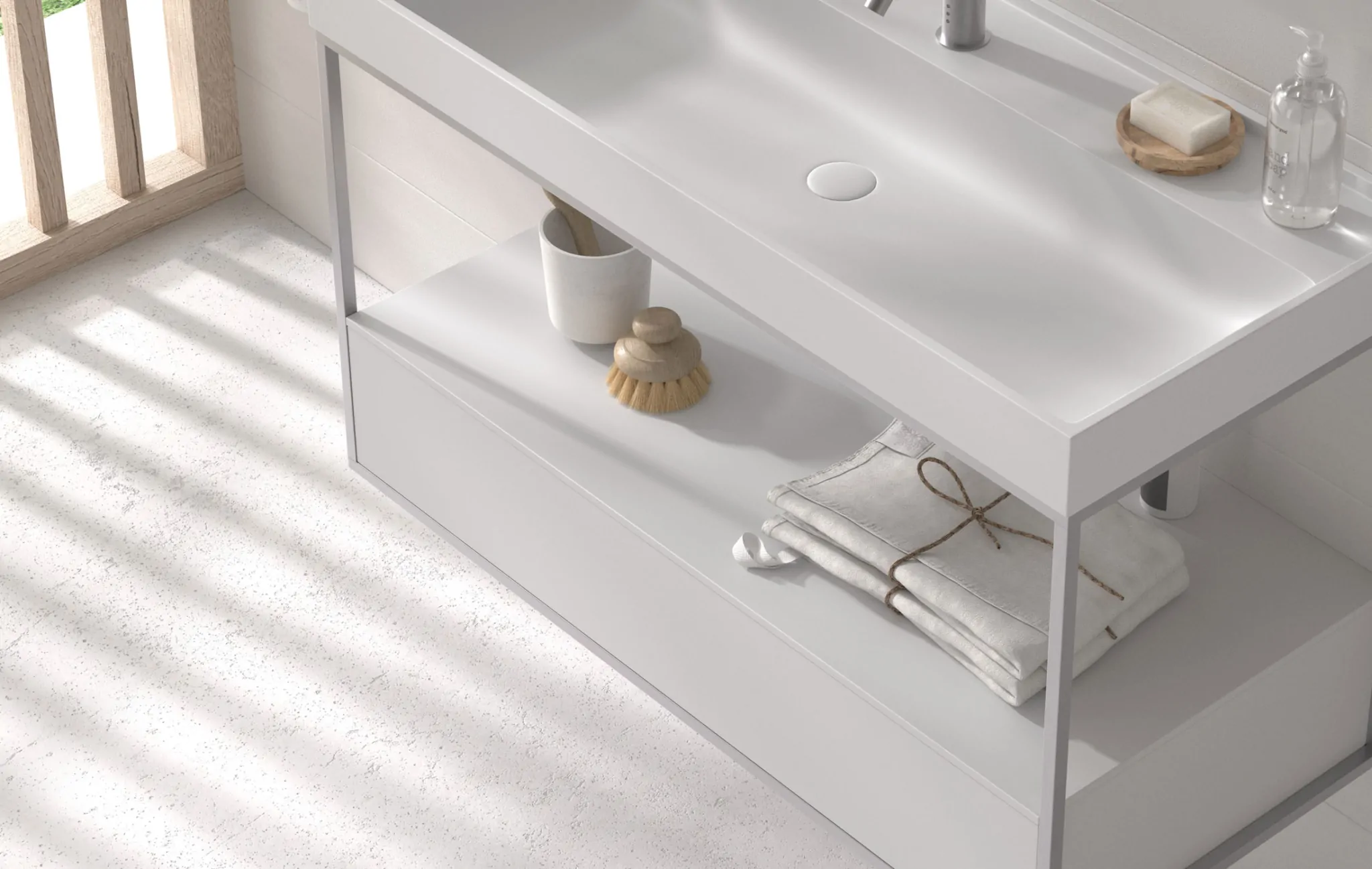 La colección se presenta en medidas de 60, 80, 100 y 120 cm. Combinable con lavabos sobreencimera con tapa o encimeras con faldón.